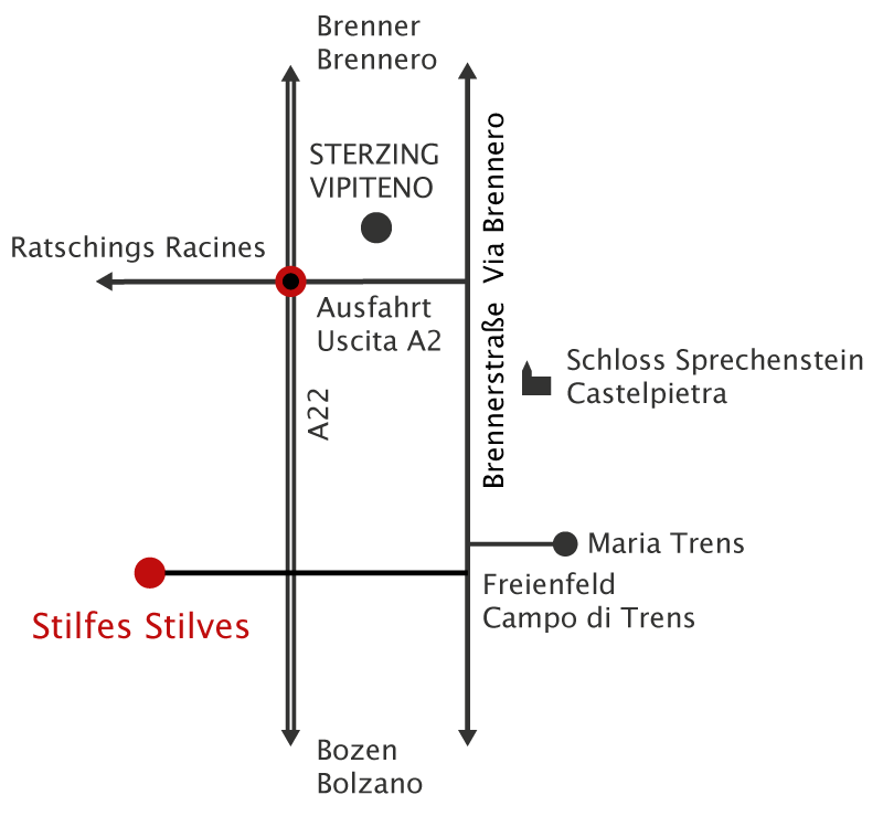 Unser Hof befindet sich in zentraler, ruhiger Lagen in Stilfes in der Südtiroler Gemeinde Freienfeld, etwa 5 km südlich von Sterzing.